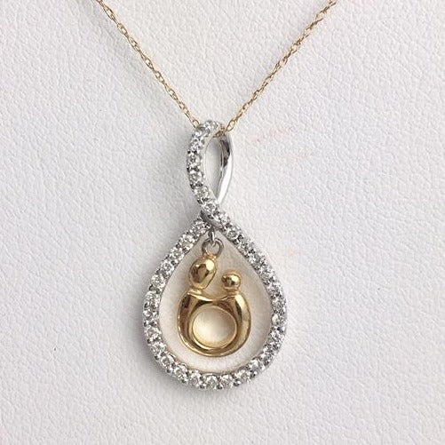 Polished 14K yellow gold mother and child, surrounded by 0.25cttw pave diamonds in white gold, 22.5mm x 12mm.