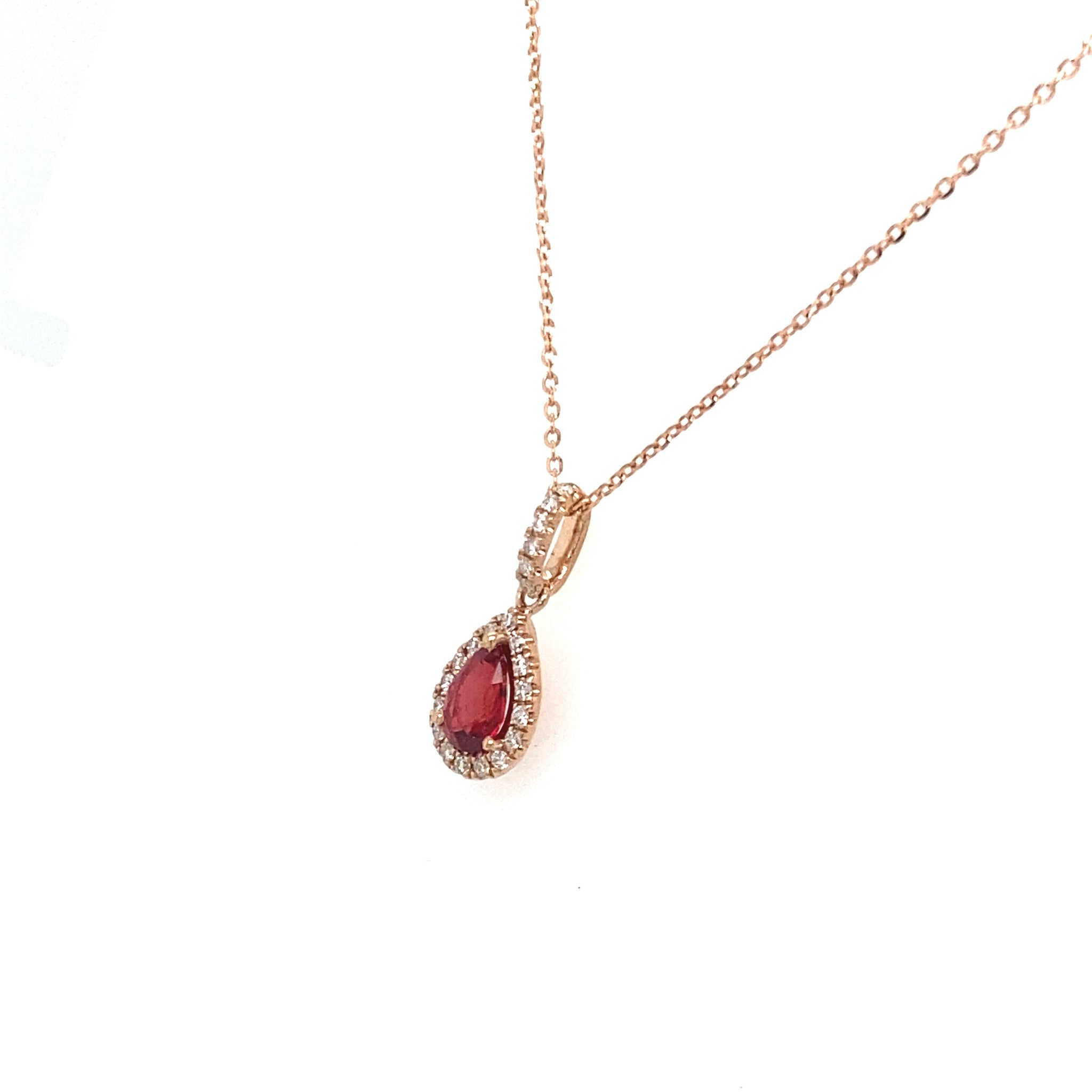 14K Rose Gold Halo Pendant With 0.11Tw Round Diamonds and 0.50ct Pear Shaped Ruby. Chain not included.
