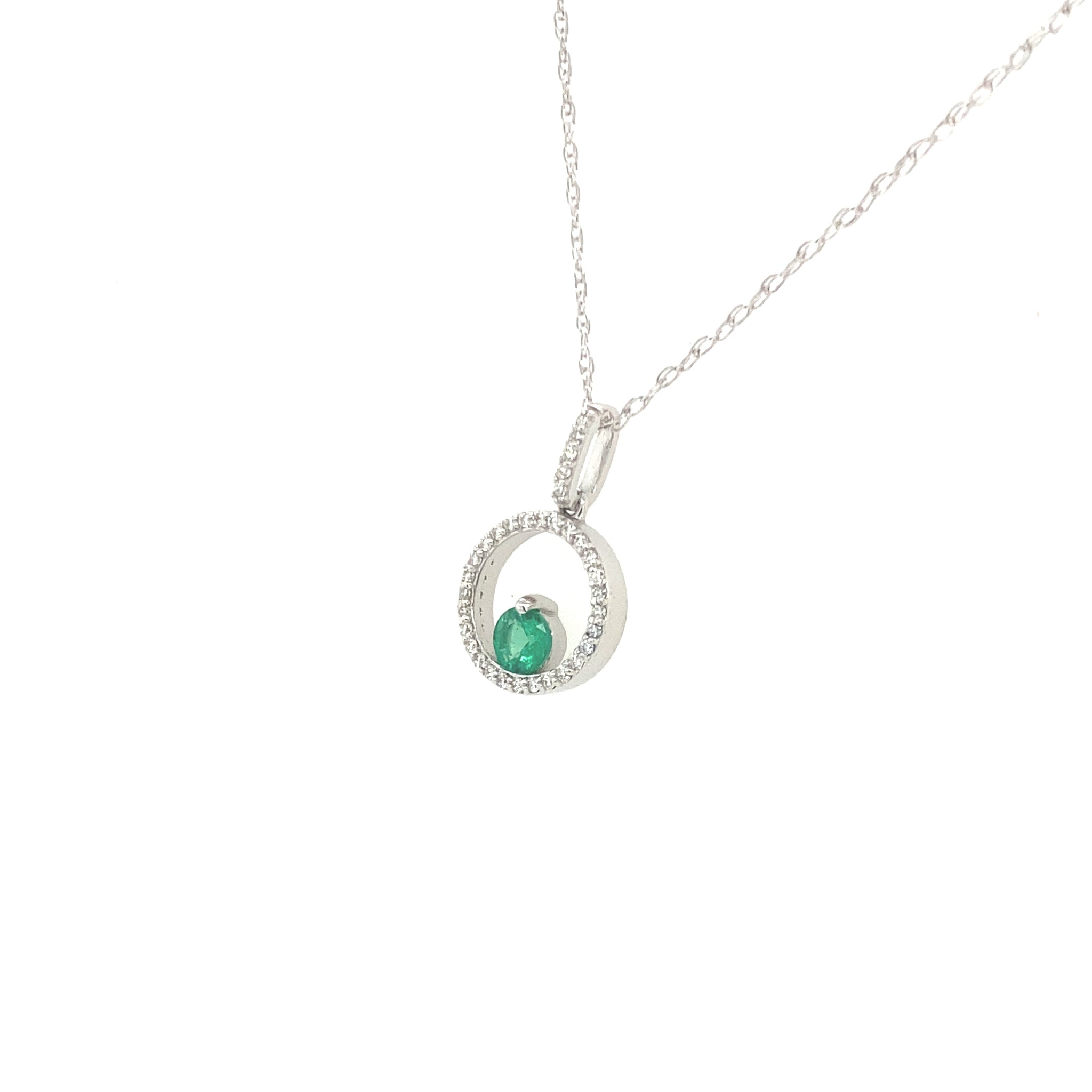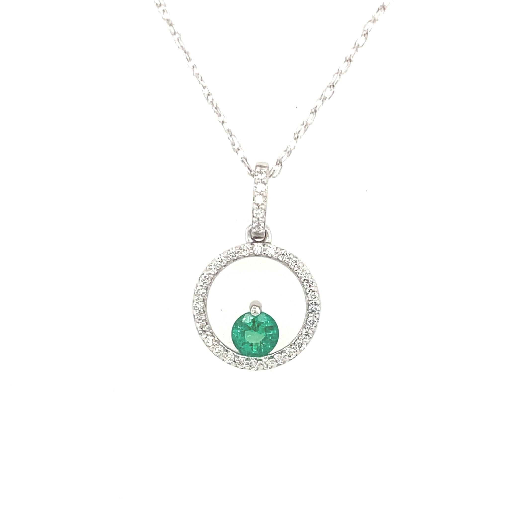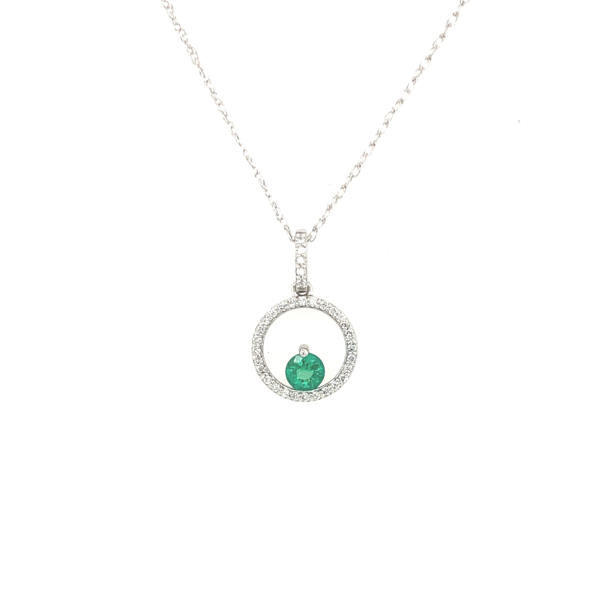 14K White Gold Circle Necklace With 0.26ct Round Emerald And 0.15Tw Round Diamonds on 18" Fine Chain.