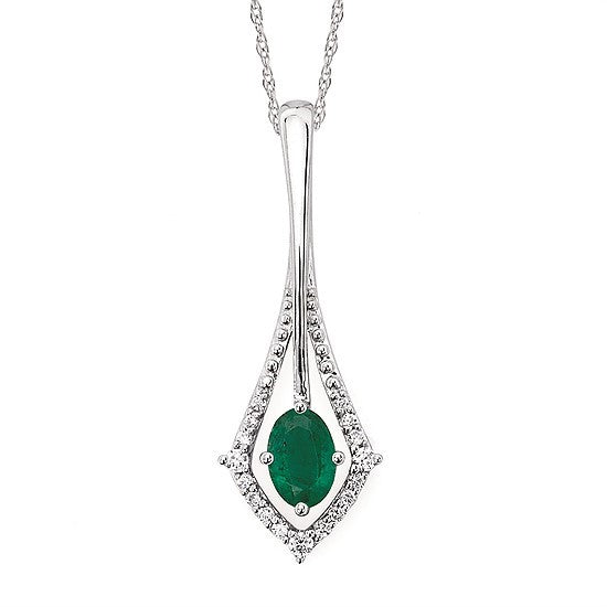 14K White Gold Drop Pendant With One 0.47Ct Oval Emerald And 0.11Tw Round Diamonds, On 18" Chain.